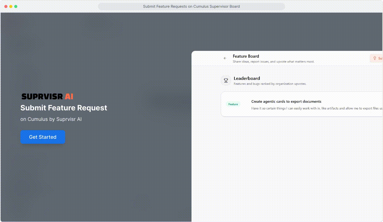The Feature Board is your direct feedback channel to the Suprvisr AI team — and a fun way to shape what gets built. Submit bugs, request features, suggest integrations, and upvote the ideas your teammates have submitted.